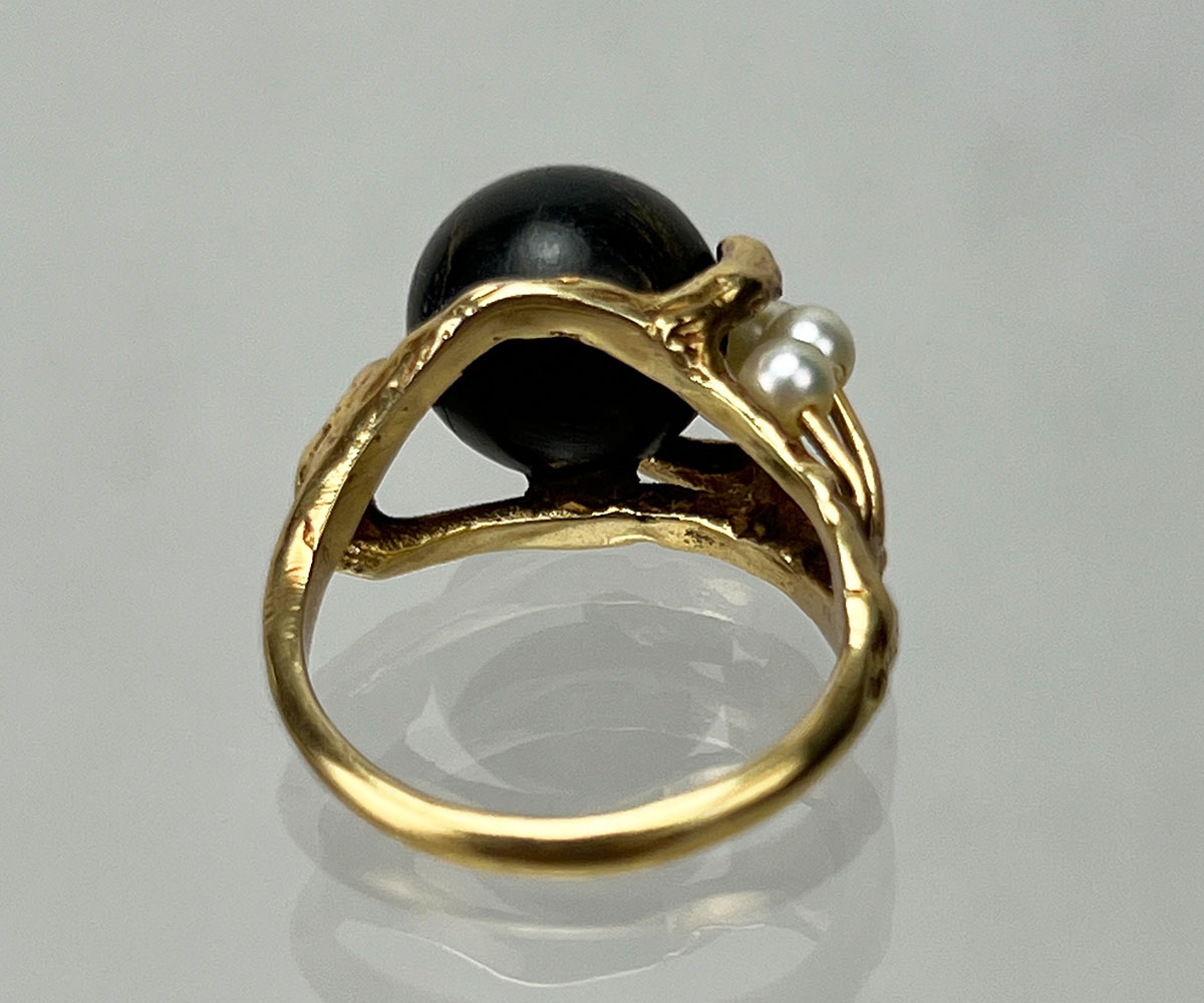 Description: Organic style 14K ring with 10mm black coral bead and cultured pearls. Can be sized. Possibly made by Maui Divers.