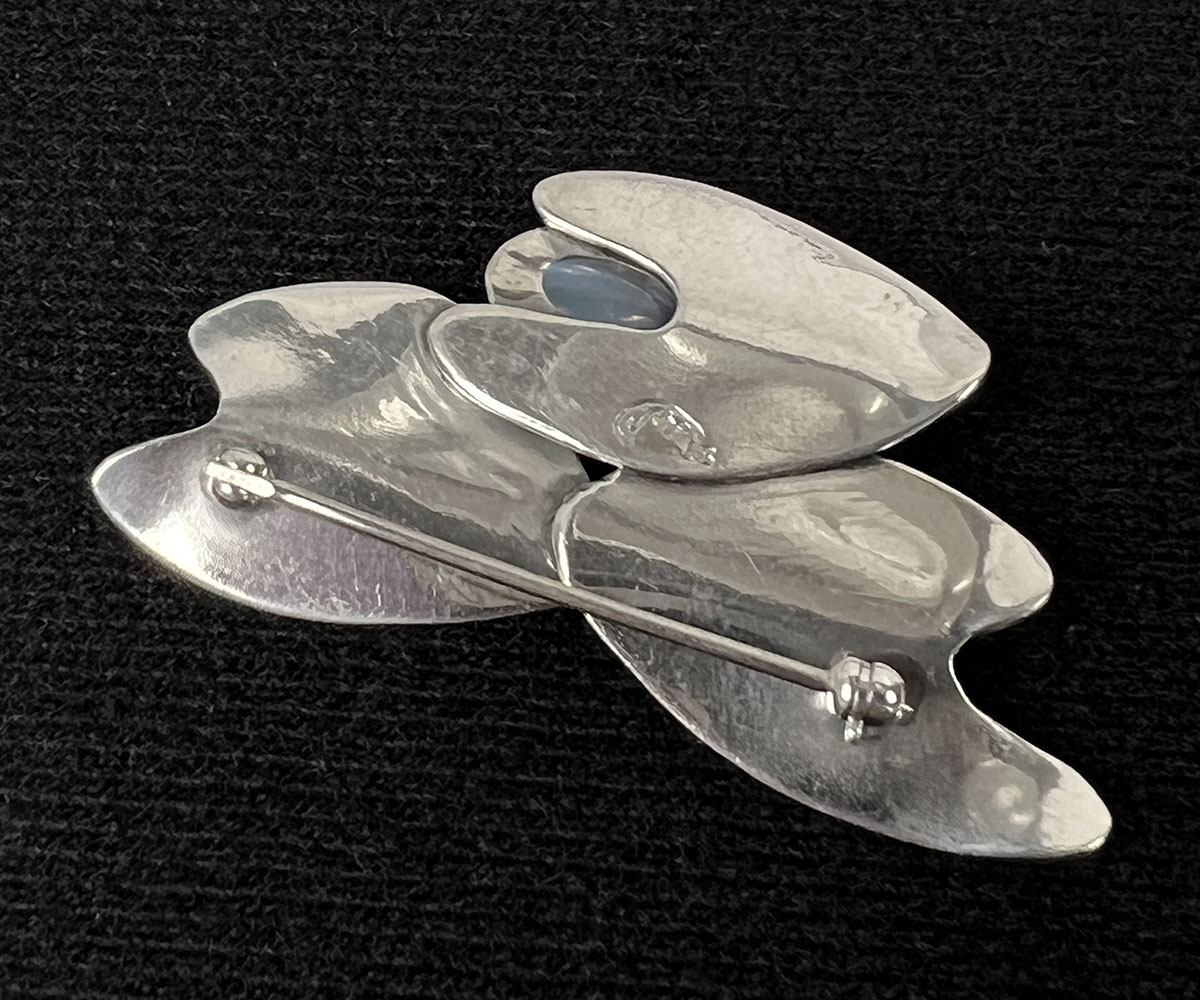 Description: Handmade sterling and moonstone modernist lilly pad brooch by Luella C. Schroeder.